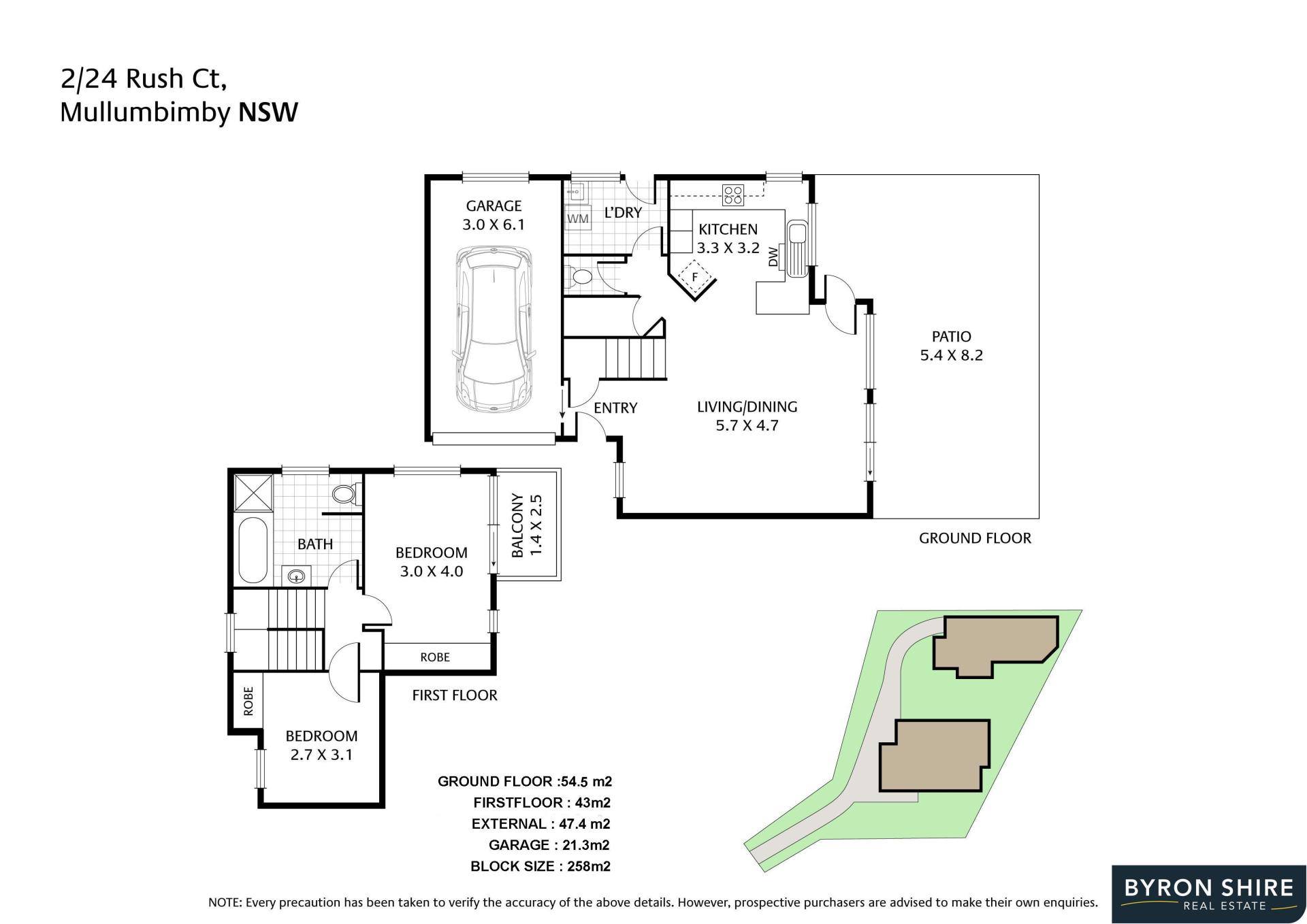 • 97m2 internal living with 2 light filled bedrooms, 1 stylish bathroom and second WC