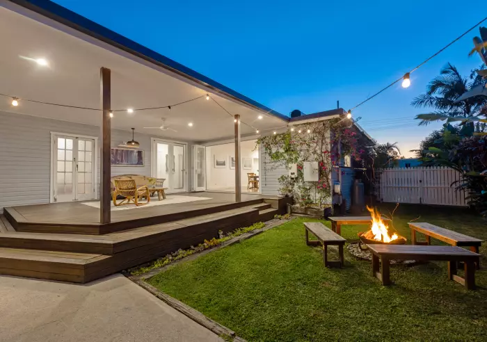 Outdoors, the home continues to shine. The fully fenced block offers established tropical gardens, fruit trees and generous lawns, with rear lane access for added convenience. Children and pets can play safely, while the lush setting creates a peaceful retreat. From the front deck, take in sunsets and views of Mount Chincogan and enjoy the winter sun.