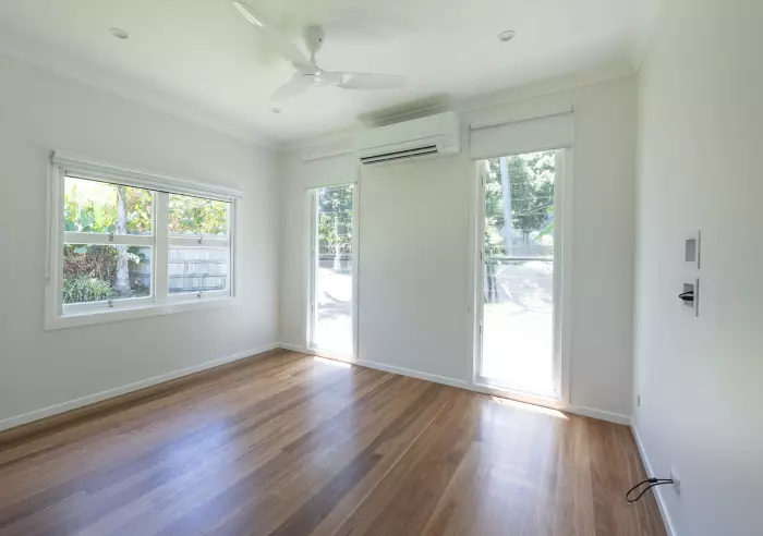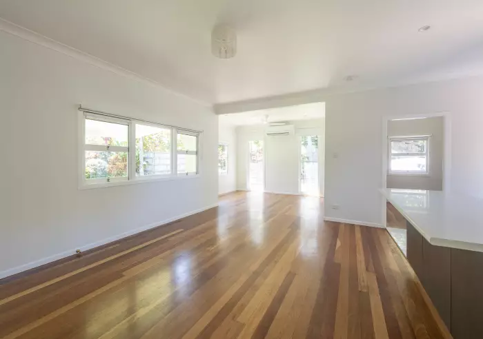 The home features a spacious open-plan kitchen and dining area, complemented by a separate living room with air conditioning. The well-appointed kitchen is complete with a dishwasher, induction cooktop, and electric oven. Timber flooring throughout the living areas and bedrooms adds warmth and charm, while tiled flooring in the kitchen ensures easy maintenance. Ceiling fans throughout & air-conditioning in the living room provide year-round comfort.