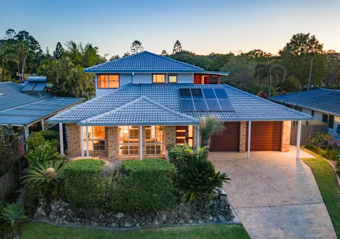 A built-in office sits conveniently at the base of the beautiful timber staircase, which leads to the upper level - a standout parents' retreat featuring a lounge area, large bedroom with walk-in robe and ensuite. Relax on the all-weather deck with a coffee or wine enjoying the superb views over the pool, gardens and Mount Chincogan to the north.