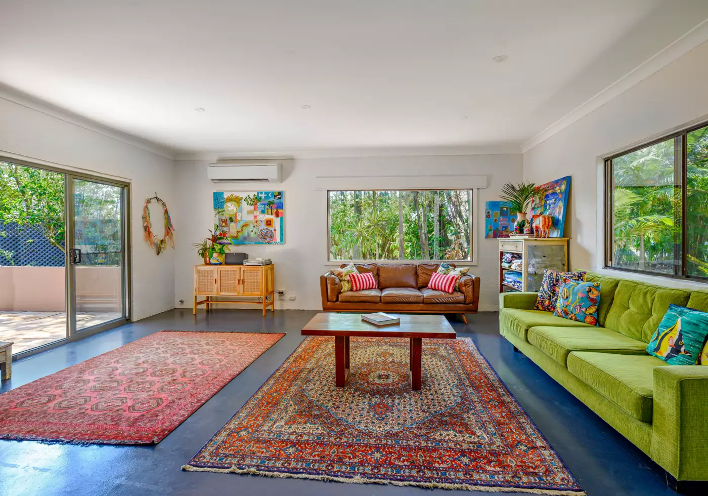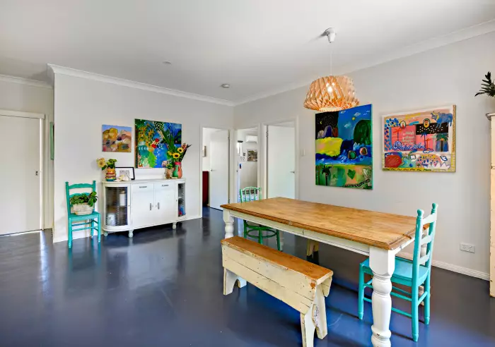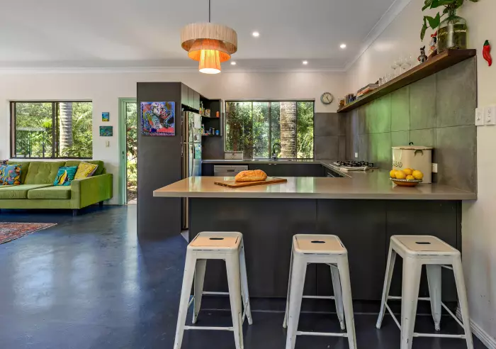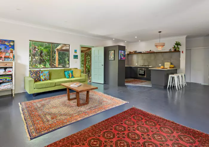The property features high ceilings, painted concrete floors, three bedrooms, and a beautifully renovated bathroom. The modern kitchen that's equipped with a dishwasher & gas cooktop flows into a spacious open-plan living area, creating a bright and inviting space for everyday living.