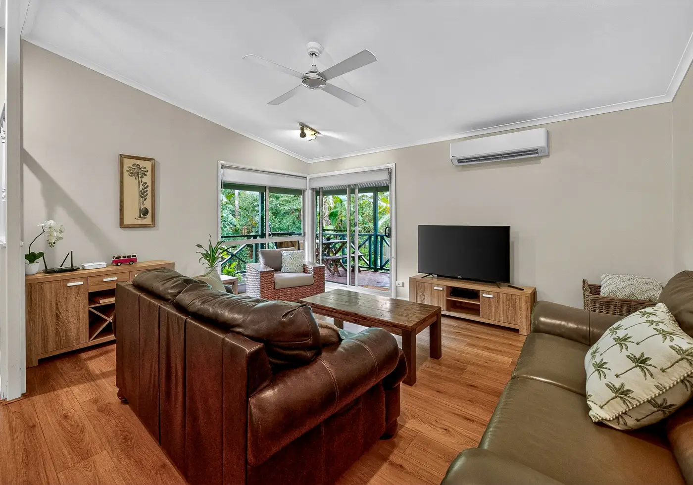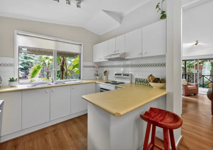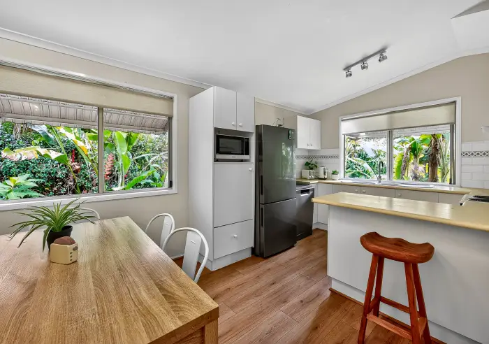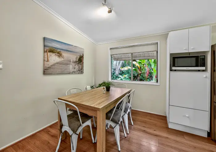 Inside, the home is light-filled and thoughtfully designed for comfortable everyday living. The functional kitchen features electric cooking and a dishwasher, flowing seamlessly into a dedicated dining space—perfect for relaxed family meals. The adjoining airconditioned living room opens out to the verandah, creating an easy indoor-outdoor connection ideal for enjoying coastal breezes & afternoon bbqs on the deck, soaking in the lush private garden outlook & listening to the abundance of birdlife.