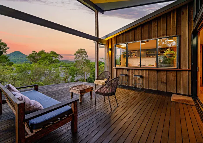 Sliding walls in the bathroom and master bedroom open directly to the surrounding forest canopy, offering a rare opportunity to shower amongst the trees or relax in bed while watching the antics of black cockatoos passing through.