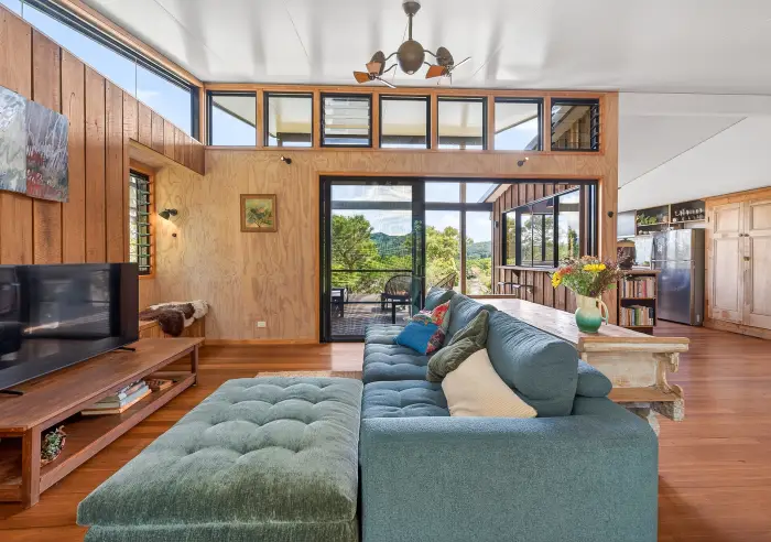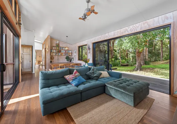 Natural, sustainable finishes define the interiors, including low-VOC harvested plywood, rough-sawn hardwood feature walls, formply kitchen joinery with locally grown and milled hoop pine benchtops, hardwood floors, and natural paints and oils. Every detail reflects a commitment to both environmental performance and aesthetic warmth.